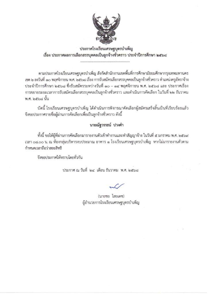 ประกาศ ผลการเลือกสรรบุคคล ตำแหน่ง ครูอัตราจ้าง 25 ธันวาคม 256825 ธันวาคม 2025 Kru_Charuporn ข่าวประชาสัมพันธ์ Kru_Charuporn